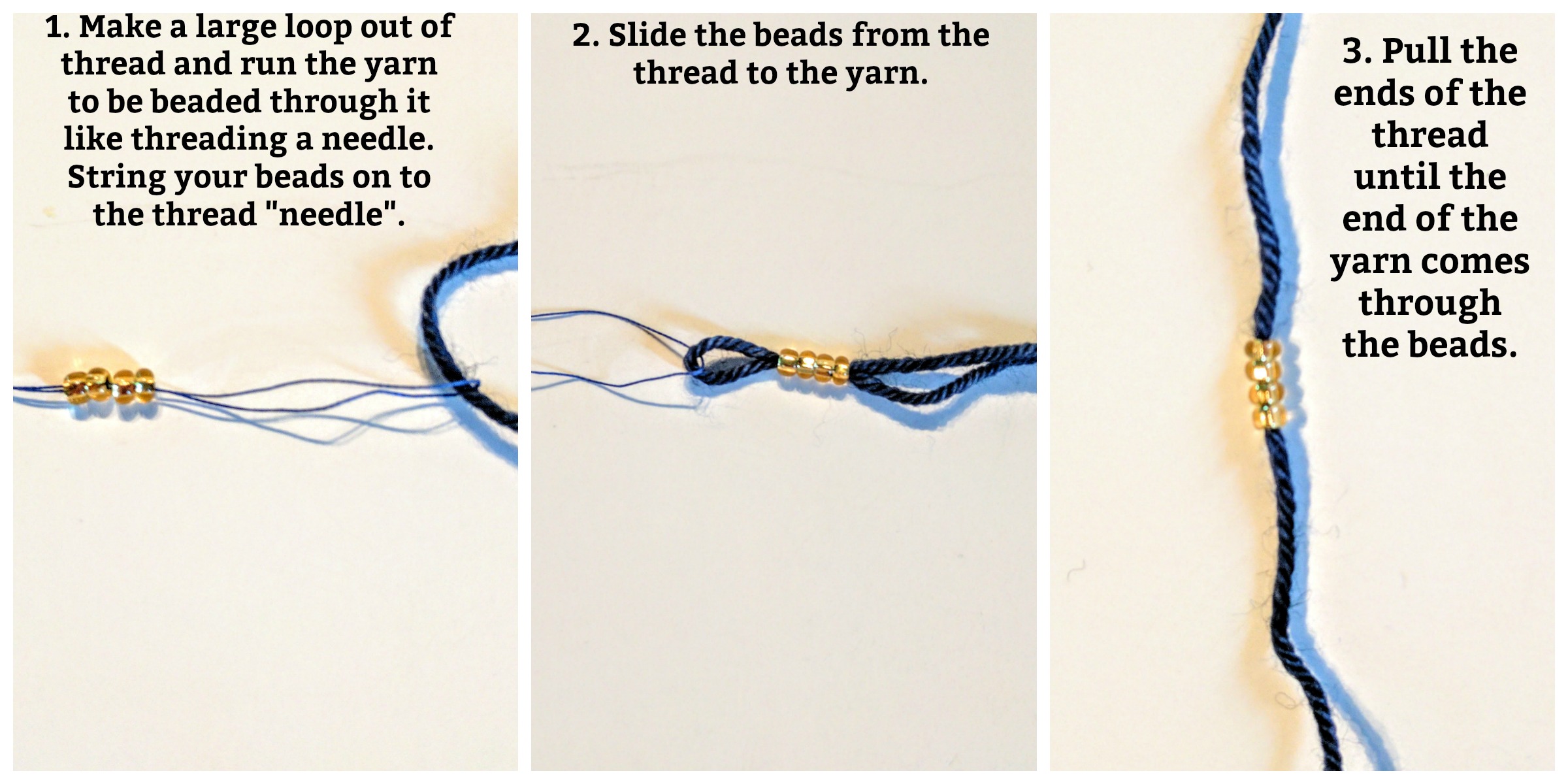 - Pre-string the beads onto your yarn.