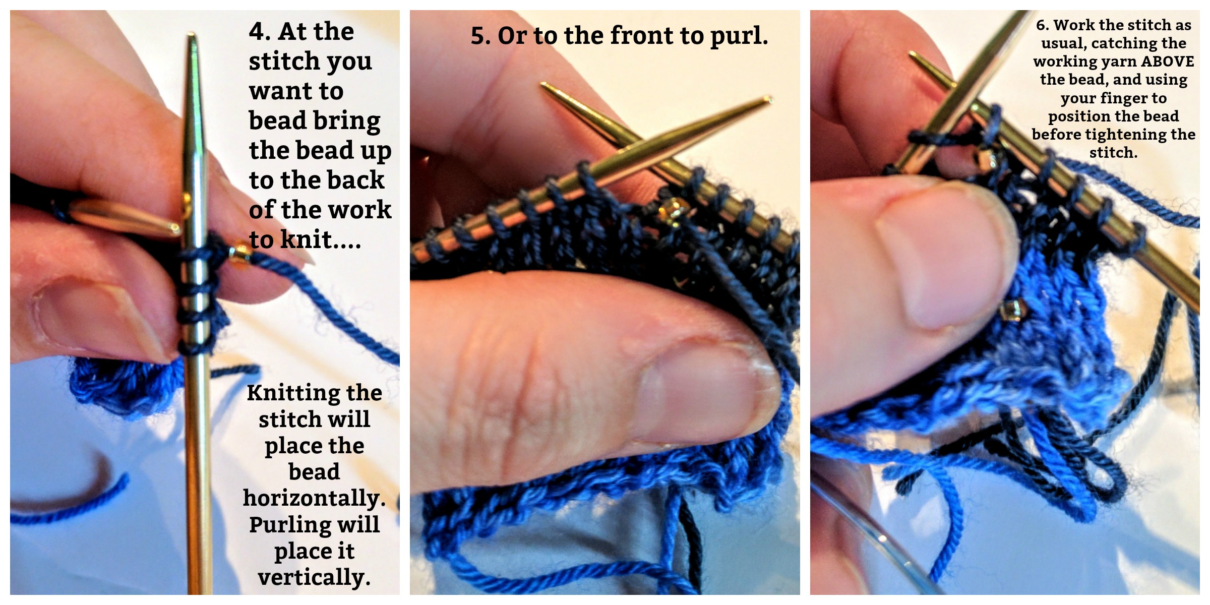 There are two ways to knit beads into a project. You can sew them on at the end, I guess, but if you’re going to use beads, they should be knit in.