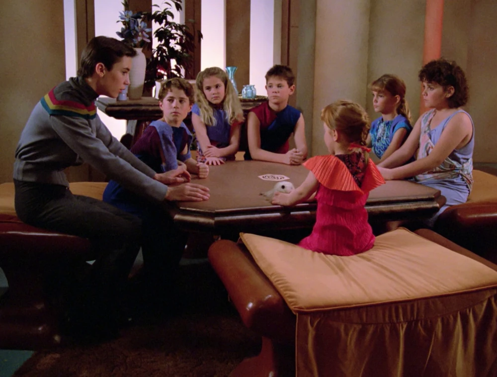 Before you cast on, let’s take a walk down memory lane of some of the greatest looks of Acting-Ensign Wesley Crusher. Here, we have Wesley, in season one, episode eight. He’s facing death for stepping on some grass. But the Endo are legally allowed to walk around in those unitards even though Wesley is clearly demonstrating that the Star Trek Universe has tasteful sweaters available.